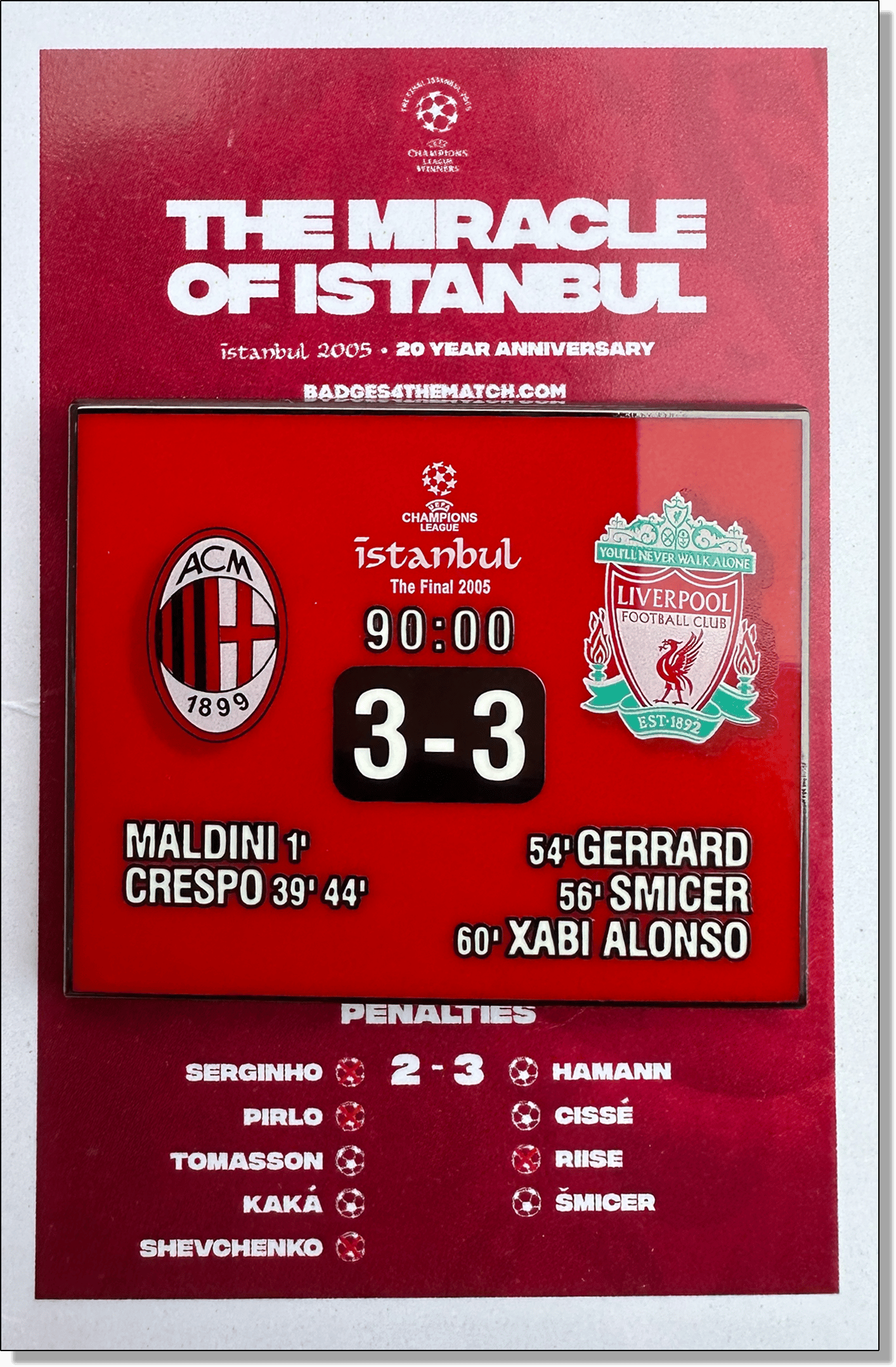 Our latest scoreboard pin badge marks Istanbul 2005, capturing the full-time score: Liverpool 3–3 AC Milan. Three goals in six second-half minutes turned disbelief into destiny, setting up the penalty shootout that delivered our 5th European Cup.