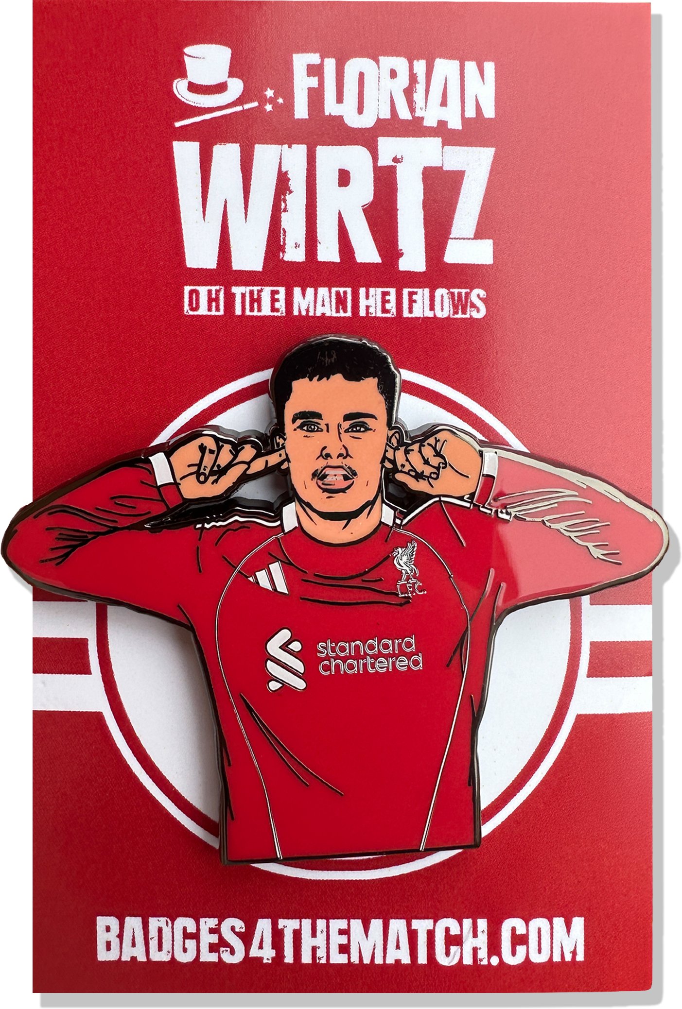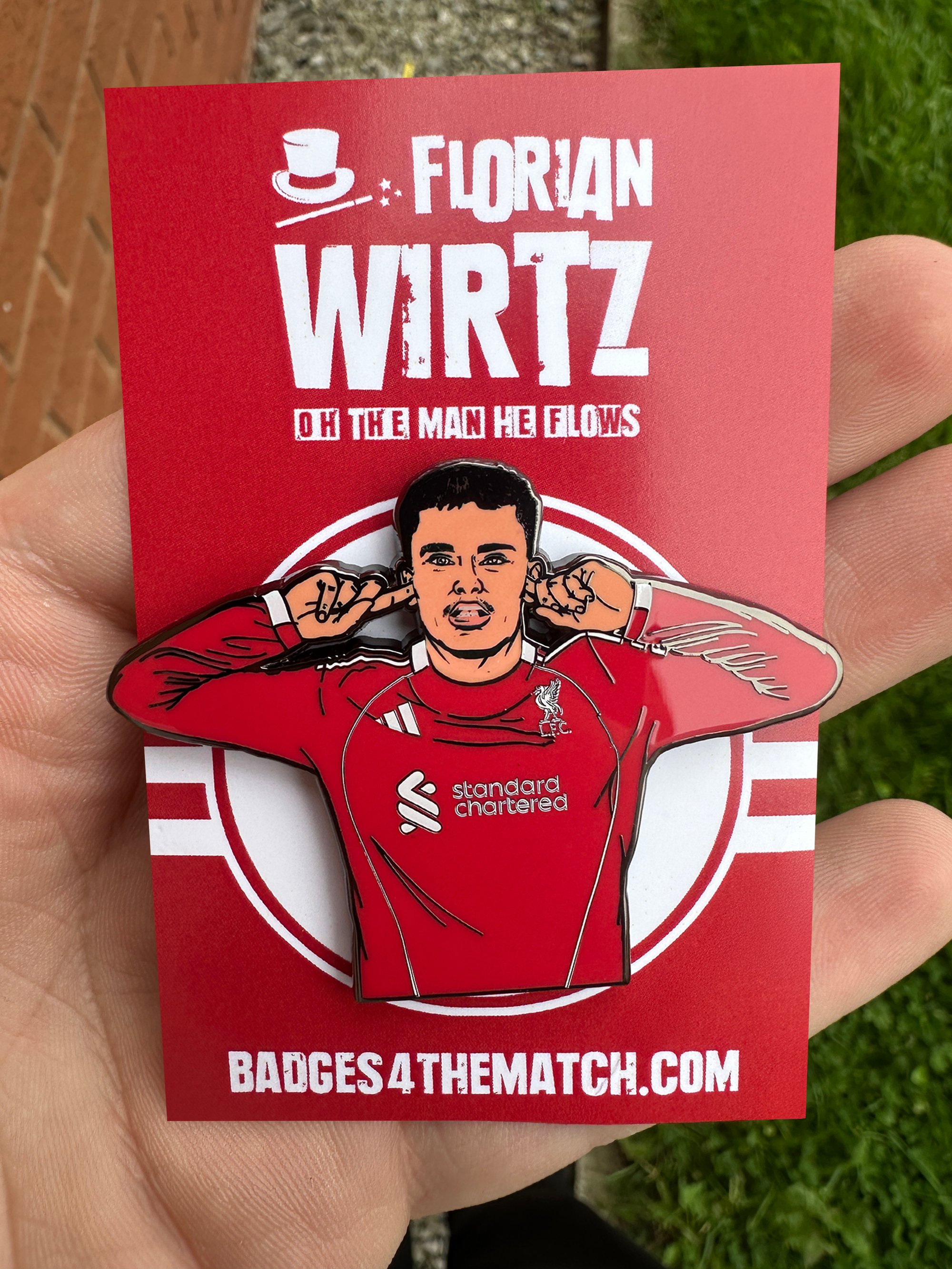 Liverpool’s record signing, Florian Wirtz! This badge features Wirtz wearing the brand-new 2025/26 Liverpool home kit, marking the Reds’ return to the iconic three stripes.
